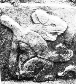 a and b, Puma and squirrel from the frieze of the Temple of the Warriors at Chichen Itzá. c, The four trees and birds set at the cardinal points to commemorate the previous destruction of the world. Sculptured panel of the Temple of the Wall Panels at Chichen Itzá. (After Ruppert.)
