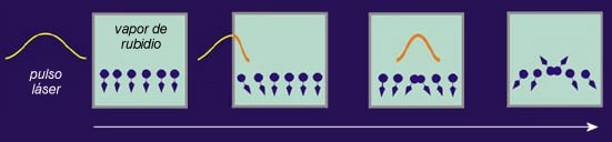 Conforme el pulso láser entra a la cámara que contiene al vapor de rubidio, la información que define la luz queda impresa en los estados de giro (spin) de los átomos (indicados por las pequeñas flechas). En el momento en que la luz es "detenida", solamente existen los estados de giro. Esta imagen de Tony Phillips está basada en otra del Instituto Americano de Física