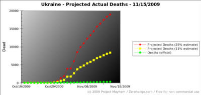 In the past two weeks, ARI have gone from near zero before Halloween to affecting 1.3 million Ukrainians. Over a million people are currently sick with probable H1N1. More importantly, there are over 75,000 total hospitalized at the time of the writing of this article, Monday 11/16. Based on these two figures (75,000/1.3 million), approximately 5.6% of those infected with this new ARI end up at the hospital.