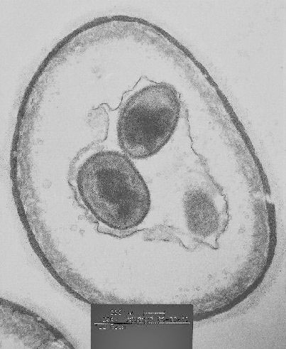 identifiable nucleus. Apparent holes in the cell wall are real.