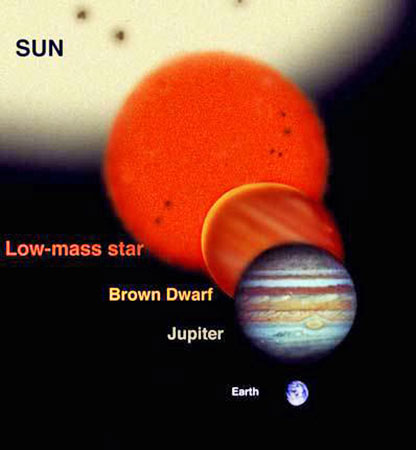 A comparison of the size of Jupiter, a brown dwarf, a small star and the Sun (Gemini Observatory/Artwork by Jon Lomberg)