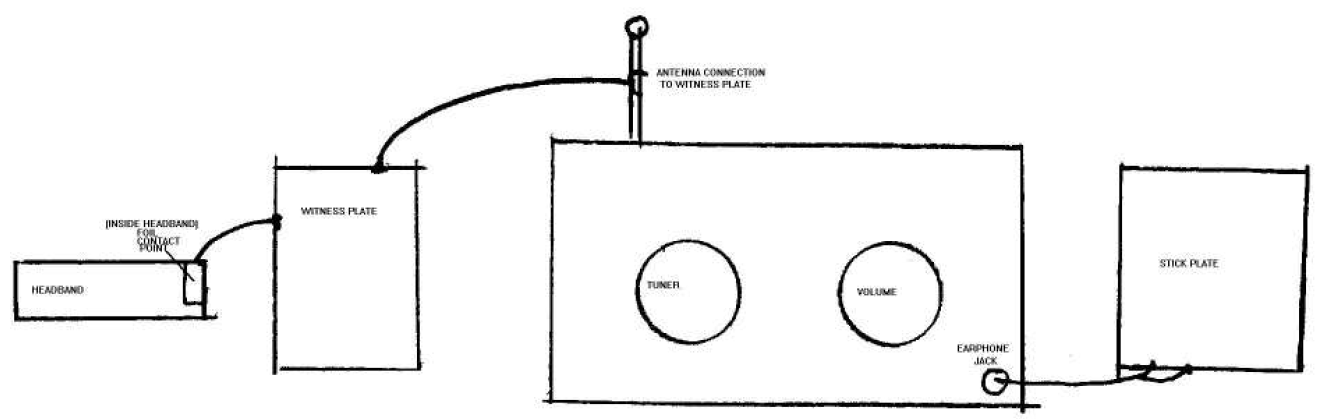 The basic helmet has the wire coming out the top coiled around a crystal to make an antenna and glued in place as in the next drawing.