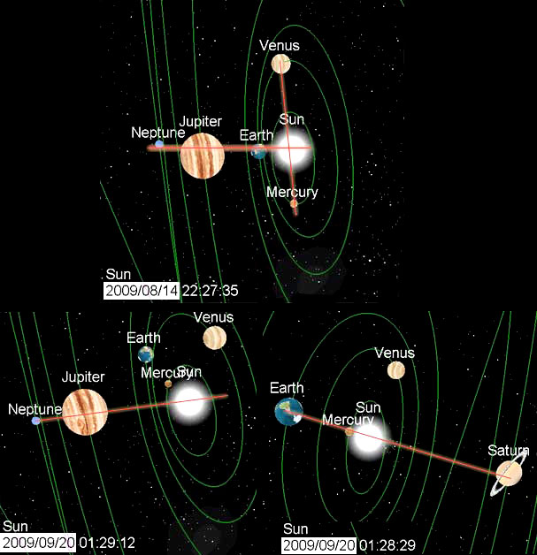 For instance, Jupiter on one side with north pole toward, and Saturn