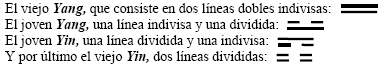 Para aclarar esta afirmación, debemos dirigirnos brevemente hacia el simbolismo numérico de las líneas, que representa una evolución desde el seis primitivo hasta el más complejo nueve, que llegó a primer plano a comienzos del período Chou. Una línea Yin se indicaba con seis y una línea Yang con nueve, que unía en sí mismo un cuatro femenino y un cinco masculino. Pero el seis y el nueve son sólo los extremos, y muestran el Yin y el Yang en continuo movimiento. En el medio quedan los estadios del siete y el ocho, el Yang y el Yin en reposo, en el cual el siete, impar, simboliza el Yang, y el ocho, par, el Yin. Así los signos luminosos consisten en cada caso en dos líneas pares (seis u ocho) y en una impar (nueve o siete), y por ende su suma es en todos los casos impar. Por su parte, los signos oscuros se componen de dos líneas impares y una par, y su suma es en cualquier caso par.