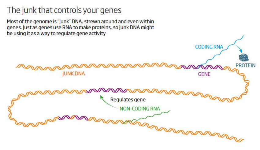 He suggests cells might transcribe junk into RNA, molecules typically associated with the process of making proteins (see diagram, below right). But this "non-coding" RNA does something else: