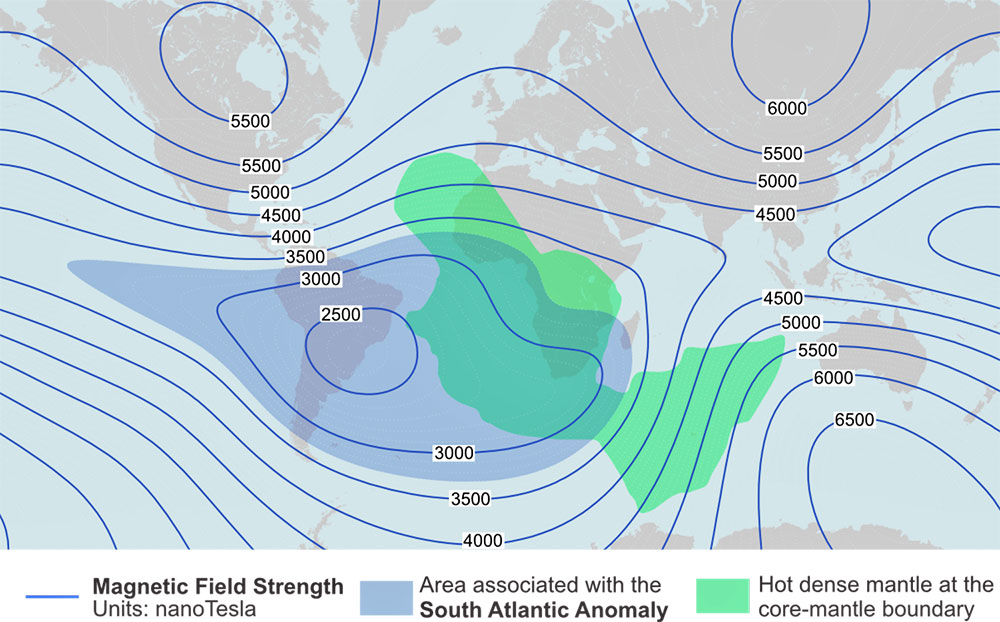 Above it, that ferromagnetic weirdness results in an overlapping region of weirdness in the planet's magnetic field called the South Atlantic Anomaly.