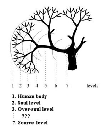 In this model we could think of the "leaves" as physical bodies and then as you move from the leaf towards the trunk we'd encounter the soul level, and then the over-soul level, and then a number of additional levels till we reached the the tree trunk coming out of the ground, the Source level.