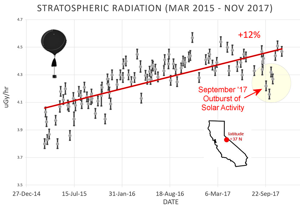 Since the spring of 2015, SpaceWeather and the students of Earth to Sky Calculus have been flying balloons to the stratosphere over California to measure cosmic rays.
