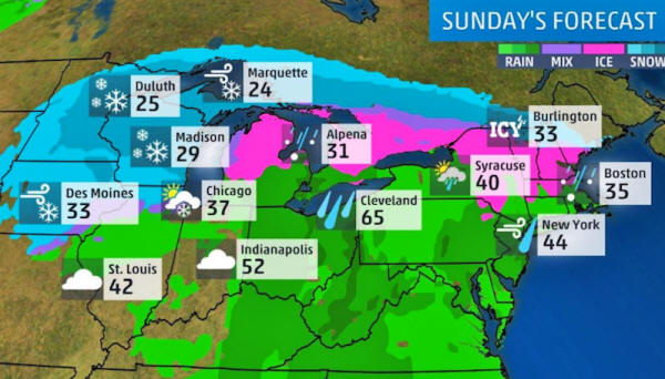 weather from warmth (65ºF and rain in Detroit, and snowing a