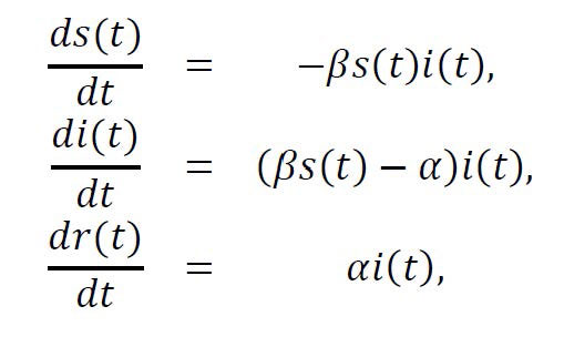 ...donde β es la tasa de infección y α es la tasa de recuperación, en el supuesto de las proporciones iniciales s(0)= s0 >0, i(0)=1- s0 >0 y r(0)=0.