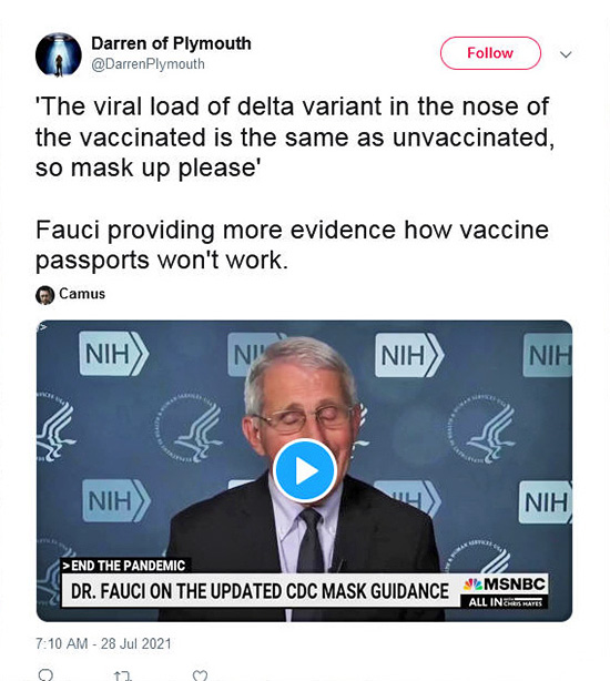 He deconstructed the cagey announcement that Dr. Anthony Fauci (below Twitter) made where he stated that the nasal titers in "vaccinated" people are the same as the unvaccinated population: