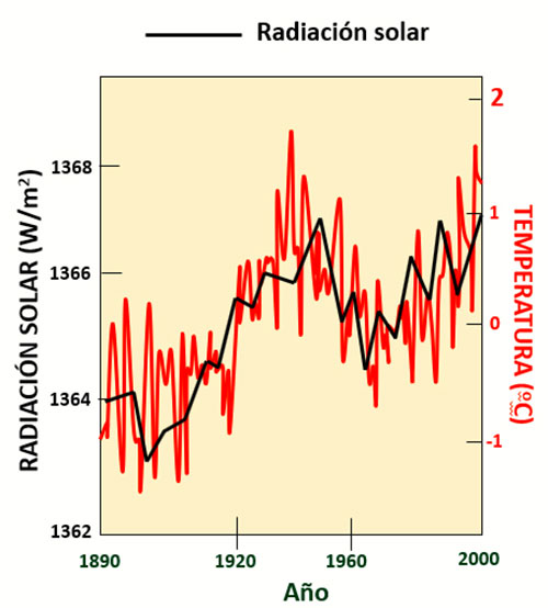 Gráfica representativa de la evolución comparada entre la temperatura (línea roja) y la actividad solar (línea negra)