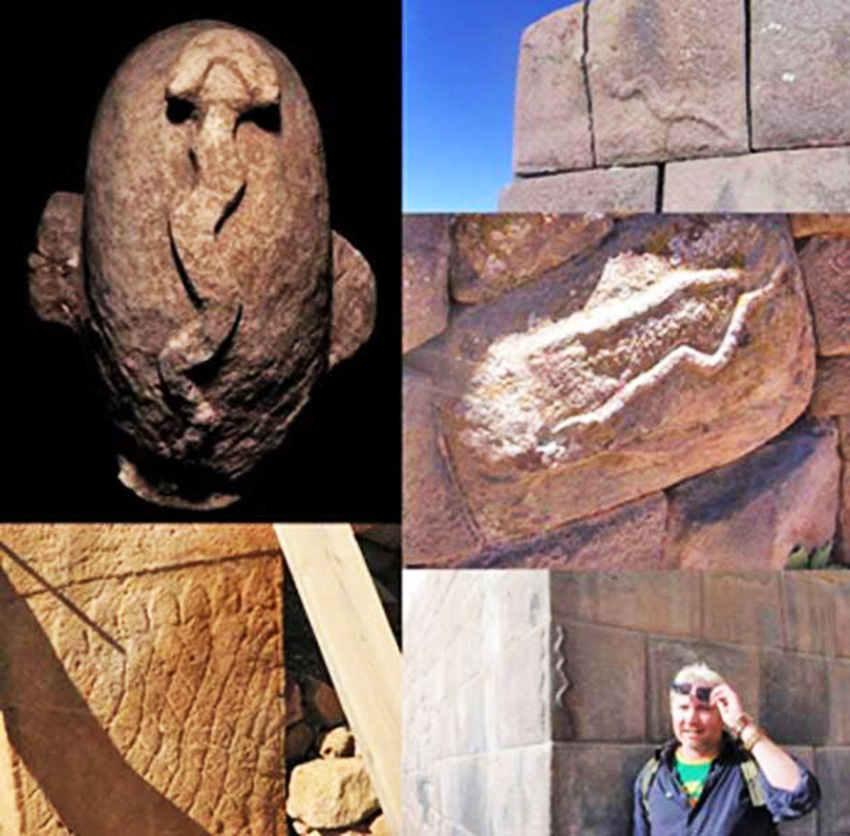 In alto a sinistra: Serpente intagliato da Nevali Cori. In basso a sinistra: Serpenti a Gobekli Tepe. In alto a destra: Sillustani, Perù. In mezzo a destra: Cutimbo, Perù. In basso a destra: Cuzco, Perù con l'autore.