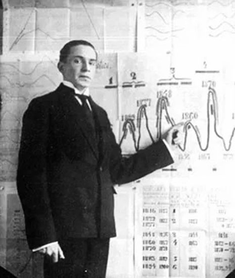 The young Soviet scientist Aleksandr Chizhevsky correlated the sun-spot cycle with major upheavals in human history. He is photographed here pointing to one of his charts.