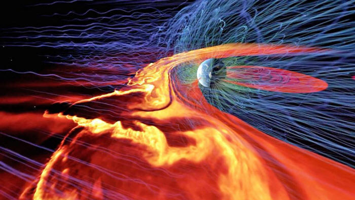 La onda de choque de una eyección coronal masiva del Sol deformando el campo magnético terrestre.