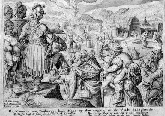 Éste le declaró la guerra y cercó el castillo durante mucho tiempo hasta que Agnes, la esposa de Reinhard, salió a parlamentar y pactó la autorización para su marcha y la de sus criadas siempre que fuera llevando cada una sólo lo más preciado.