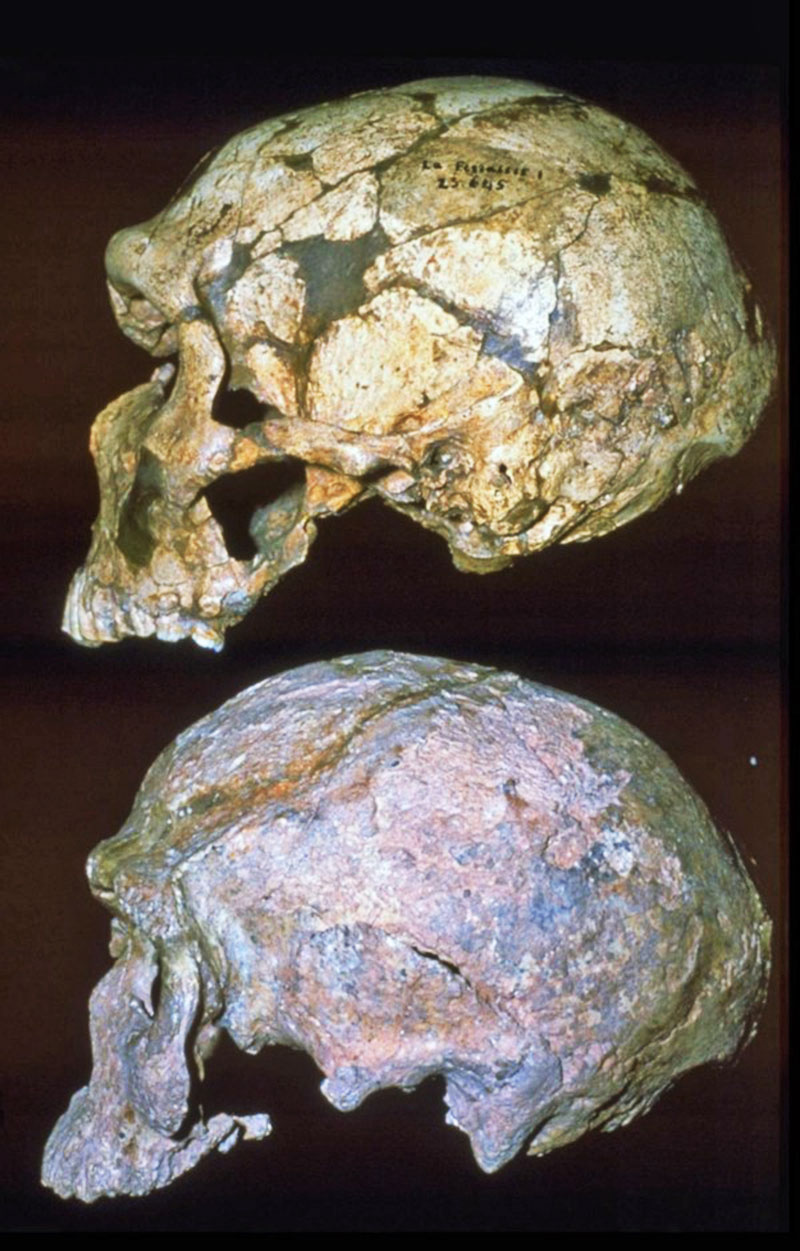 compared to Jebel Irhoud 1 skull (bottom). The face of Jebel Irhoud is shorter than the Neanderthal, but it has a clear and continuous browridge, and its braincase is not very much like modern humans.
