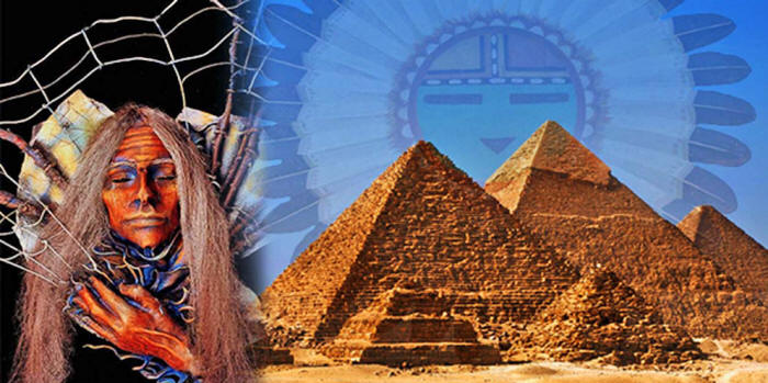 Derecha, Pirámides de la meseta de Guiza (CC BY-SA 2.0) y Creador de la mitología Hopi (Public Domain). Izquierda: la Mujer Araña del folklore nativo americano. (CC BY-SA 3.0).
