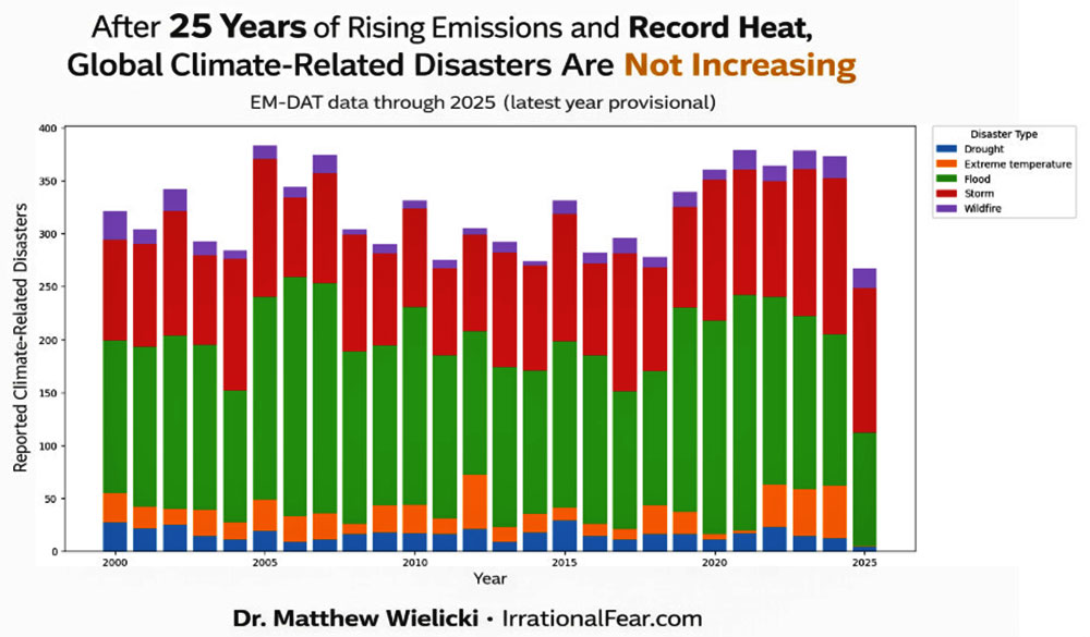 After 25 years of rising emissions and record heat, the disaster surge that was supposed to justify a global emergency never materialized...!