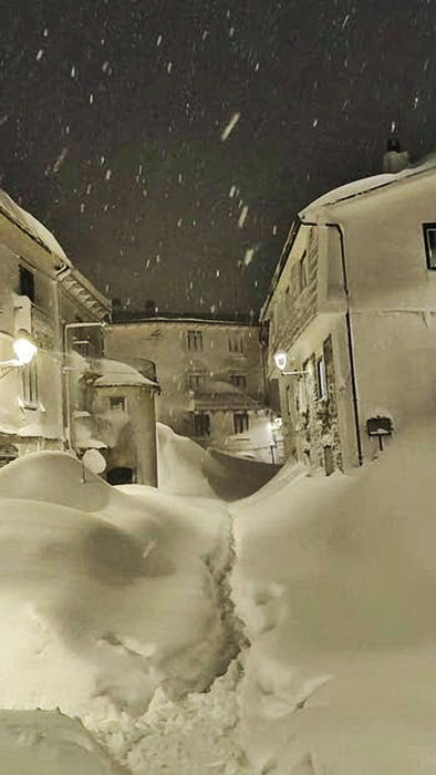 The mountain town in Molise, sitting at 1,421 m (4,662 ft), was recently hit by a blizzard that dropped 1.5 m (59 in) of snow in about 24 hours.
