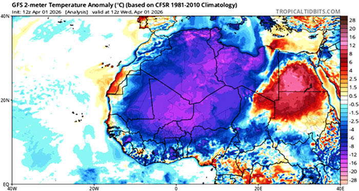 Latest forecasts show temperature anomalies of roughly 15ºC below normal across parts of northern North Africa. Exceptional chill sweeps the Sahara.