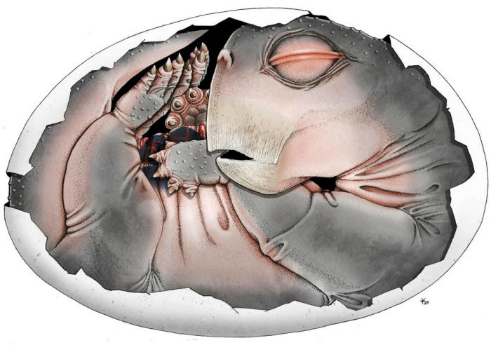 For instance, the dimensions of the rock nodule in which it is preserved are consistent with those of an egg. And the curled posture of the embryo follows an ovoid shape like that of an egg.