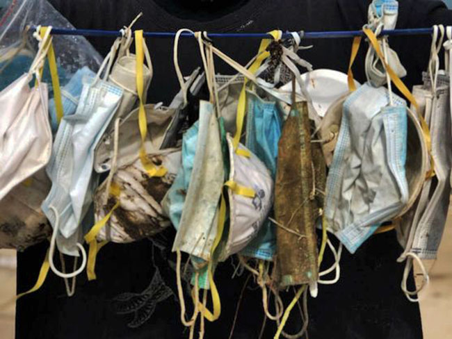 por R. Badillo decenas de mascarillas desechables encontradas en el mar.