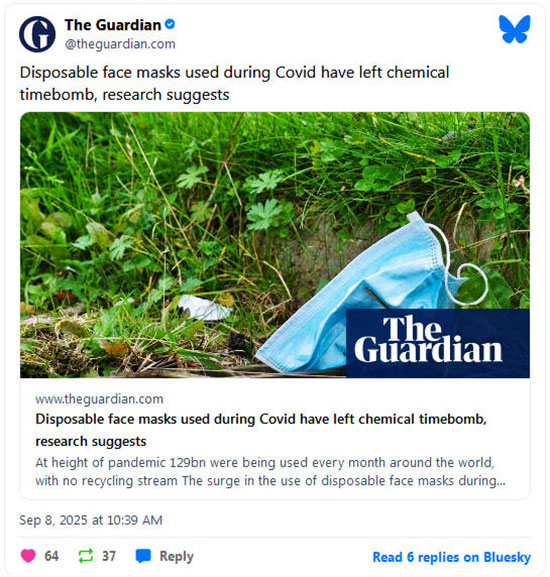 Un estudio (Disposable surgical/medical Face Masks and filtering Face Pieces - Source of Microplastics and Chemical Additives in the Environment) publicado en la revista Environmental Pollution alerta de que,