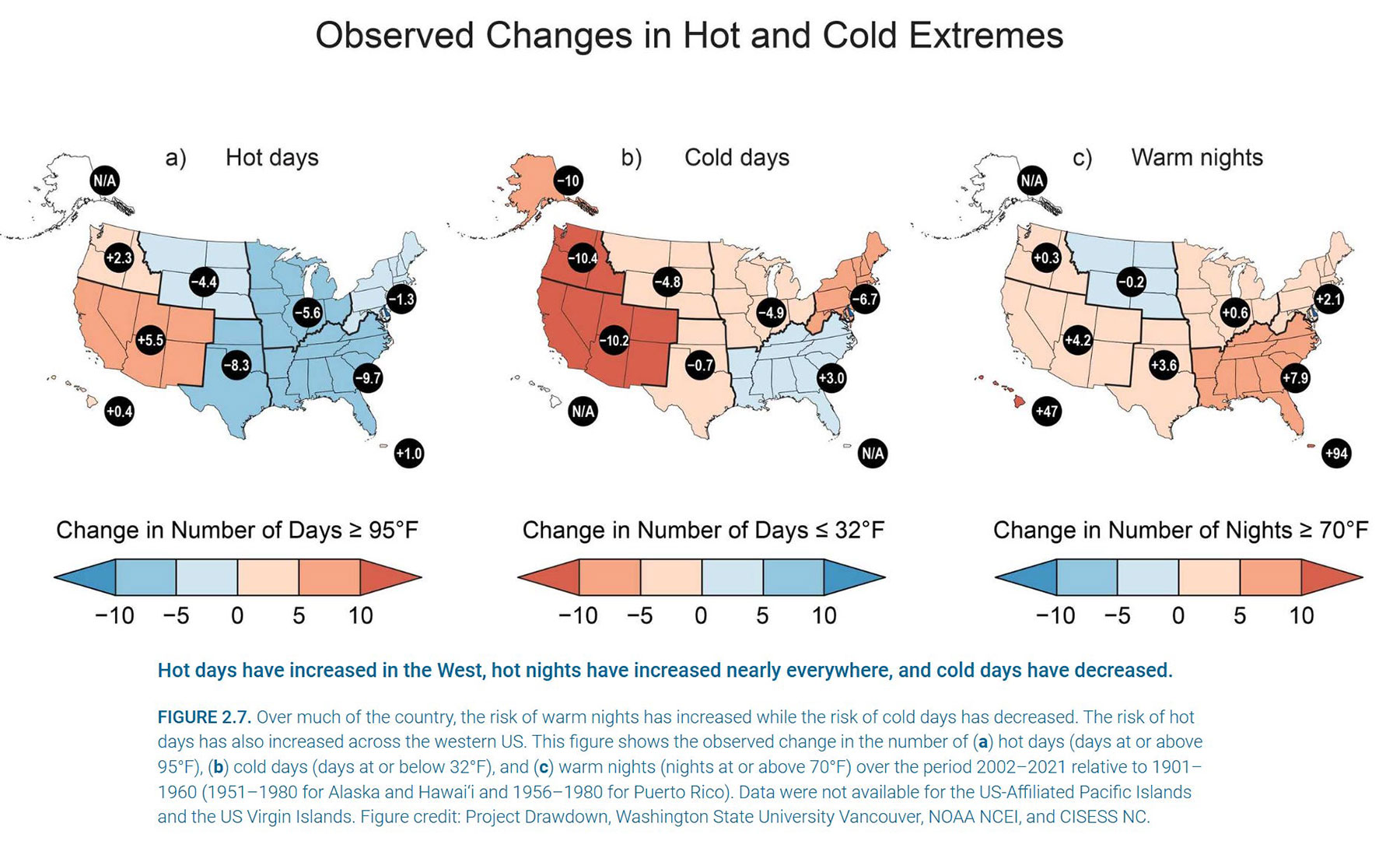 Instead, the number of hot days has decreased across most of the United States, except the West Coast.