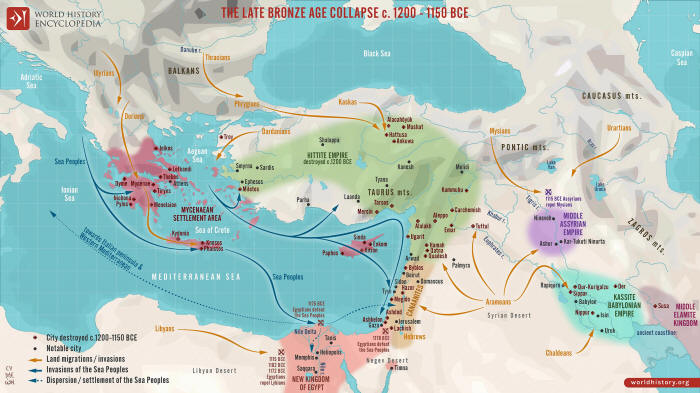 With the environmental crisis, there were floods of migrants across the Mediterranean. The Egyptian inscriptions refer to the so-called Sea Peoples, a confederation that attacked settlements along the coast.