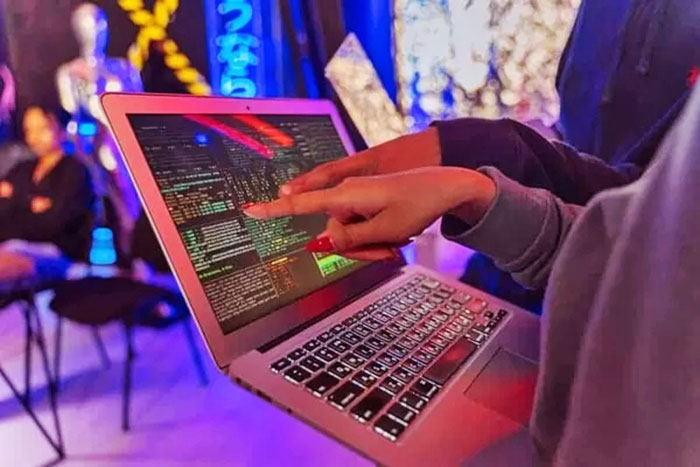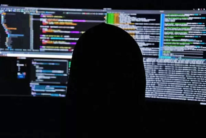 in una stanza poco illuminata e digita del codice su un laptop per sfruttare le vulnerabilità del software.
