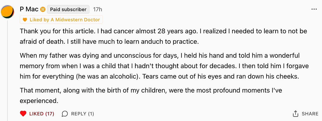 This powerfully reinforces why the medicalization of death is so problematic: