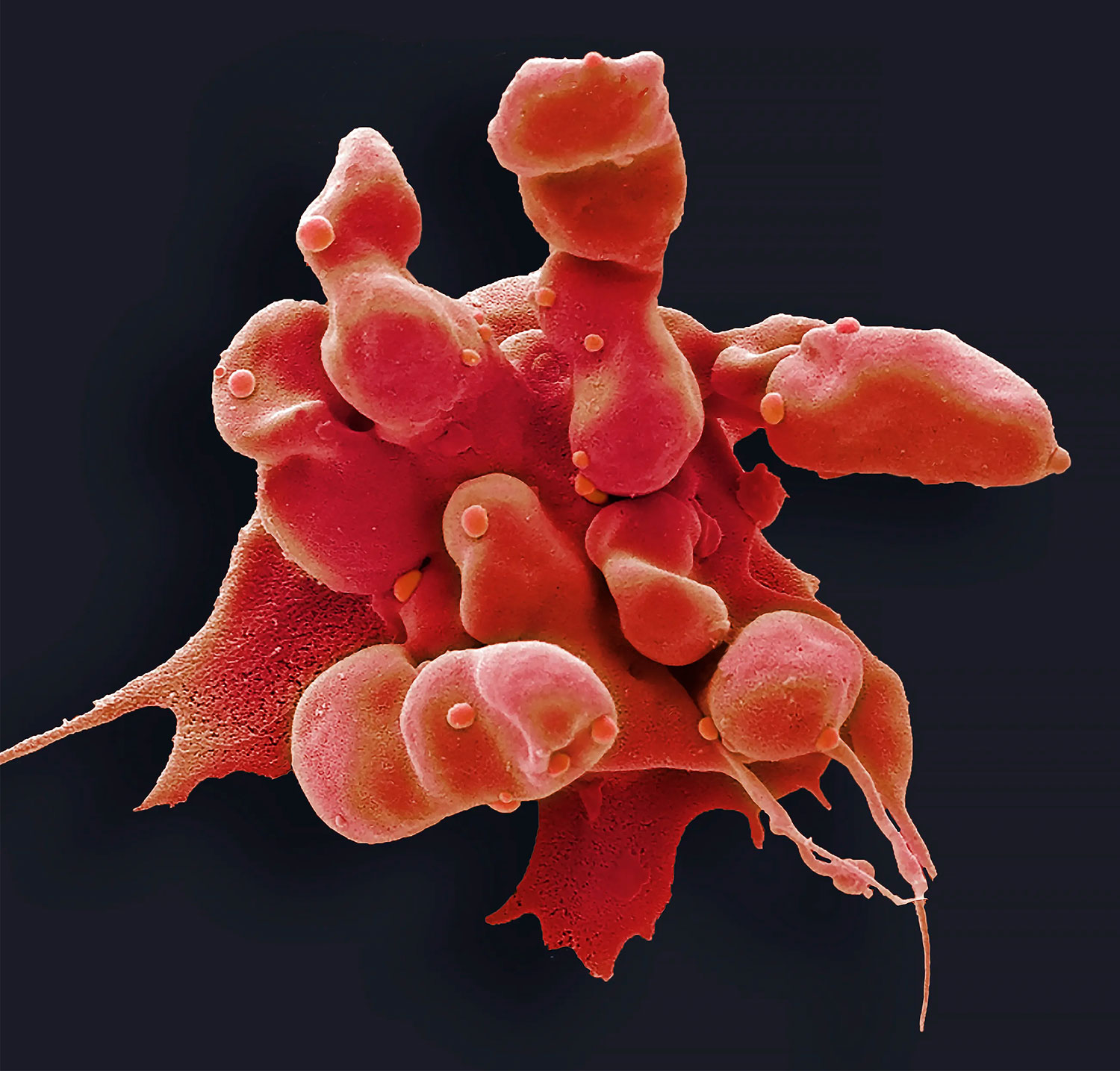 A kidney cell in the early stages of apoptosis shows its hallmark "blebbing" on a colored scanning electron micrograph. Its membrane bubbles and deforms