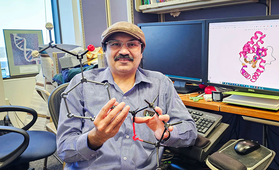 More than 20 years ago, L. Aravind (pictured here holding a model of a molecule targeted by programmed cell death) posited that eukaryotes gained tools for apoptosis when they acquired mitochondria. Today he believes they gained apoptotic proteins