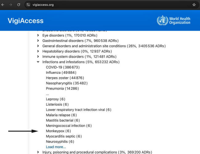 They are listed under "infections and infestations" that emerge as "side effects" of the Pfizer mRNA vaccine.