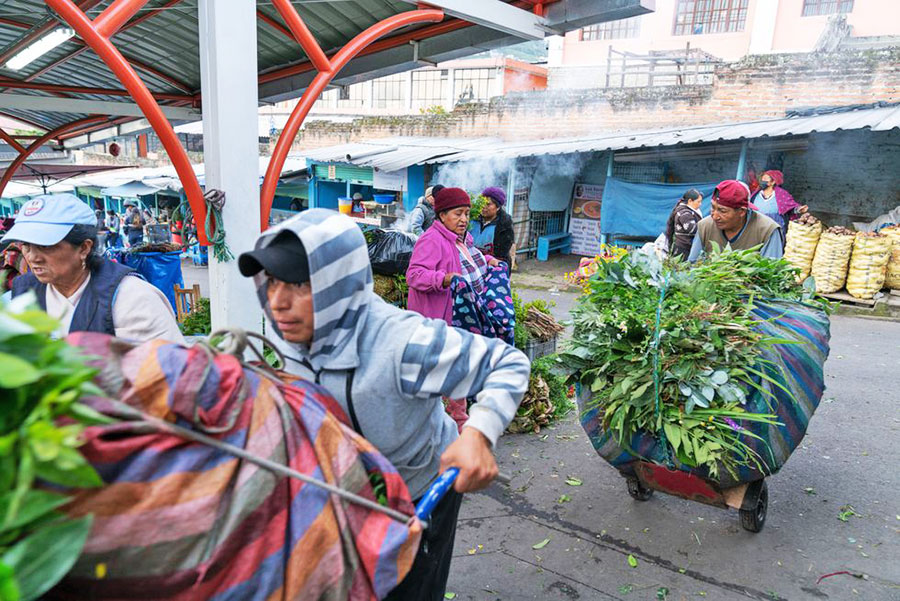 Cargadores ayudan a los clientes a transportar varios sacos cargados de plantas medicinales. Ana Maria Buitrón