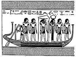 The third boat is called PA-KHET, "The Branch," and each end terminates in the head of a lion. In the middle of it stands the form of Osiris, who is called SHEFSHEF, and he wears on his head a pair of ram's horns; his arms and the upper