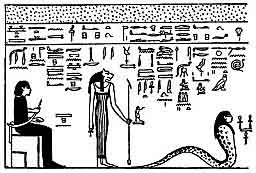 2. The serpent NEHA-HRA, which is transfixed to the ground by means of six knives. The goddess SERQET stands with a band round his neck in the act of