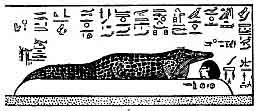 4. A god in human form, seated on a throne, wearing plumes and an uraeus on his head, with "life" in his right hand, and the sceptre in his left; this god is called AFU-ASAR, and he is seated under a canopy which is formed by the body of a monster serpent called ANKH-ARU-TCHEFAU-ANKH-ARU. The text which refers to the first three gods reads: "The Majesty of this great and holy god saith, Grant thou me to come forth on the path by thy spittle(?) and by [thy] throat and let me utter the word which is maat to Ankhit, and let me open thy fold, for I have come to illumine the darkness, and to embrace him that is in Mehen." The text which refers to AFU-ASAR reads: