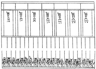 I. Gate. NEBT-SETAU-QAT-SEBT-HERT-NEBT-KHEBKHEBT-SERT-METU-KHESEFET-NESHENIU-NEHEMET-UAI-EN-I-UAU.