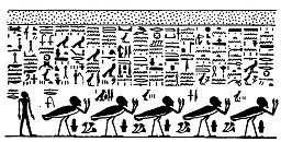 "[This scene representeth] what Horus doeth for his father Osiris. The enemies c who are in this scene have their calamities ordered for them by Horus, who saith unto them:--Let there be fetters on your arms, O enemies of my father, let your arms be tied up towards your heads, O ye who have no [power], ye shall be fettered [with your arms] behind you, O ye who are hostile to Ra. Ye shall be backed in pieces,