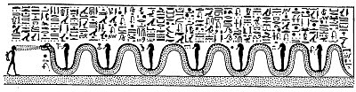 (Far left) Horus the Aged. (Right) The Burnt Enemies of Osiris.and belches fire into the face of their leader; the name of this serpent is KHETI, In each undulation stands a bearded god in mummied form, and the hieroglyphics written above describe them as "the gods who are above KHETI,"