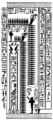 of gods stand two sceptres, each of which is surmounted by a White Crown; the one on the right is the symbol of OSIRIS, (SAR), and the other of HORUS. Between the sceptres is a line of text, which reads:--"They say to Ra, '[Come] in peace! [Come] in peace! [Come] in peace! [Come] in peace! O thou whose transformations are manifold, thy soul is in heaven, thy body is in the earth. It is thine own command, O great one." The monster serpent which stands on his tail and guards the door is called AM-NETU-F, and the two lines of text which refer to his admission of Ra read:--"He who is over this door openeth to Ra. SAU saith to AM-NETU-F, 'Open thy gate to Ra, unfold thy portal to KHUTI, so that he may illumine the thick darkness, and may send light into the hidden abode.' This gate closeth after the great god hath passed through it, and the gods who are on the battlements wail when they hear it closing upon them."