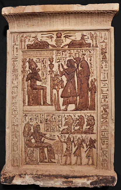 La parte superior de la estela muestra a la pareja rindiendo homenaje a Osiris, el dios egipcio del inframundo, mientras que la parte inferior muestra a la pareja sentada en sillas con seis de sus hijos frente a ellos.