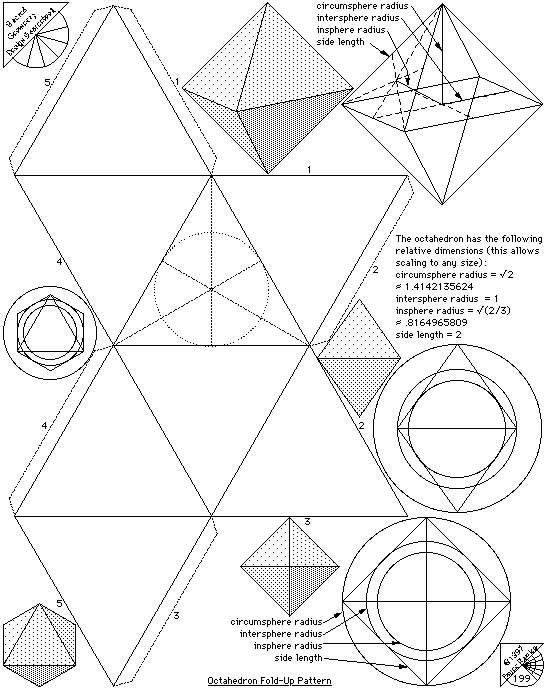To the Greeks, these solids symbolized fire, earth, air, spirit (or ether) and water respectively. The cube and octahedron are duals, meaning that one can be created by connecting the midpoints of the faces of the other.