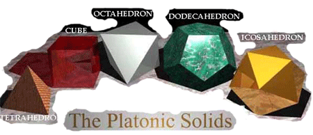 The 5 Platonic solids, Tetrahedron, Cube or (Hexahedron), Octahedron, Dodecahedron & Icosahedron, are ideal, primal models of crystal patterns that occur throughout the world of minerals in countless variations.