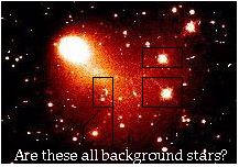 Here's another familiar image to those that have been following the story. Note that the objects identified appear to be "in front" of Hale Bopp. Most have a streak trailing them, suggesting tails or dust trails. Are these fragments of the greater comet?