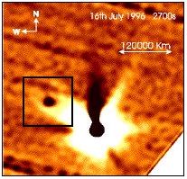Notice that the "objects" move with the comet. The distance between comet and object is comparable to the distance displayed in the other pictures on this page. This distance appears greater than the previous distance due to the fact that the comet is approximately 4 AU's closer.