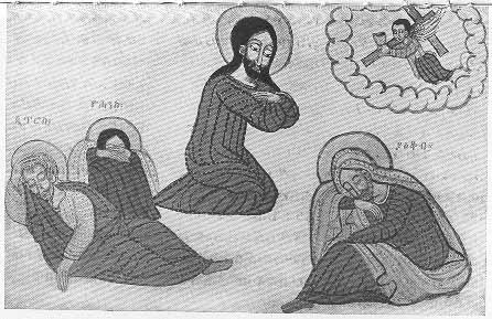 An angel bringing the Cross and the cup to Christ in the Garden of Gethsemane. By Him are Peter, John, and James asleep