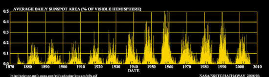 It wasn't until the 19th Century (AD), however, that astronomers finally realized (from examination of European sunspot records extending back through the Middle Ages...) that there was a remarkable (if totally mysterious) "periodicity" to the appearance and disappearance of these dark "solar apparitions"... resolving to an average "sunspot cycle" period of ~11 years (below)...